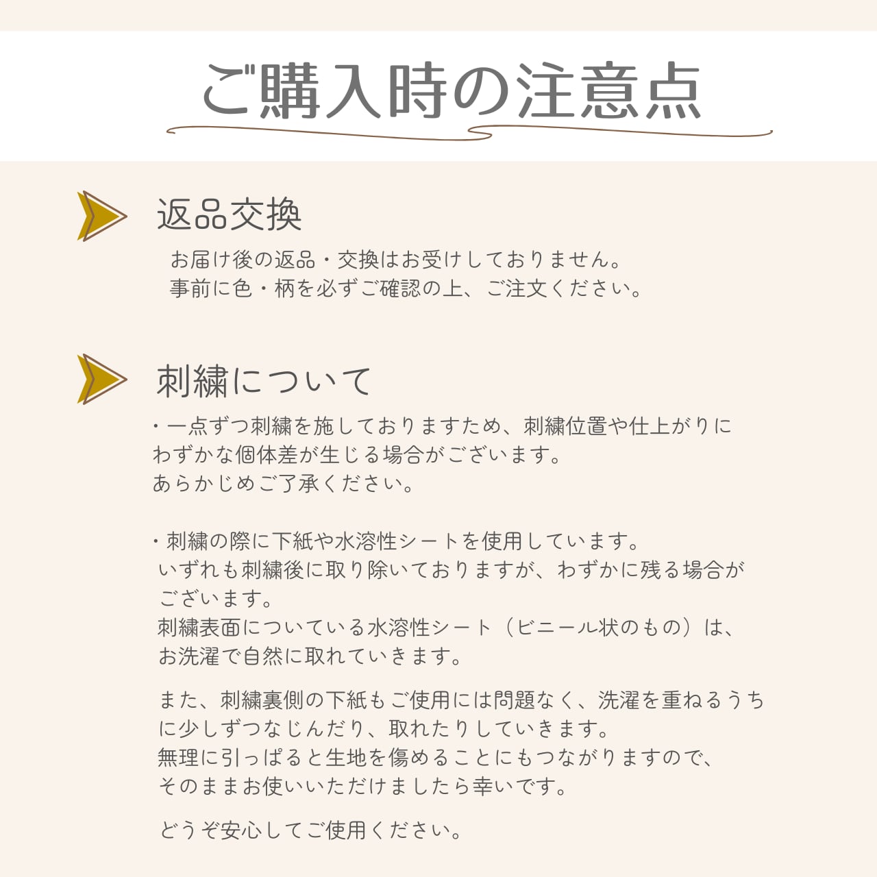 ・一点ずつ刺繍を施しておりますため、刺繍位置や仕上がりに わずかな個体差が生じる